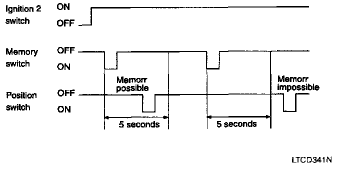 1. If position switch (POS1 or POS2) is pressed within 5 seconds after pressing the memory switch under ignition 2 on, it registers current mirror position. (Switch module sends in LIN communication). (Memory permit status lasts for 5 seconds after memory switch ON. After 5 seconds, memory permits status terminates. In other words, current position is registered if the position switch (POS1 or POS2) is turned on, during the memory permit status). However, RH side mirror position is not registered during the LH side mirror manual switch operation.