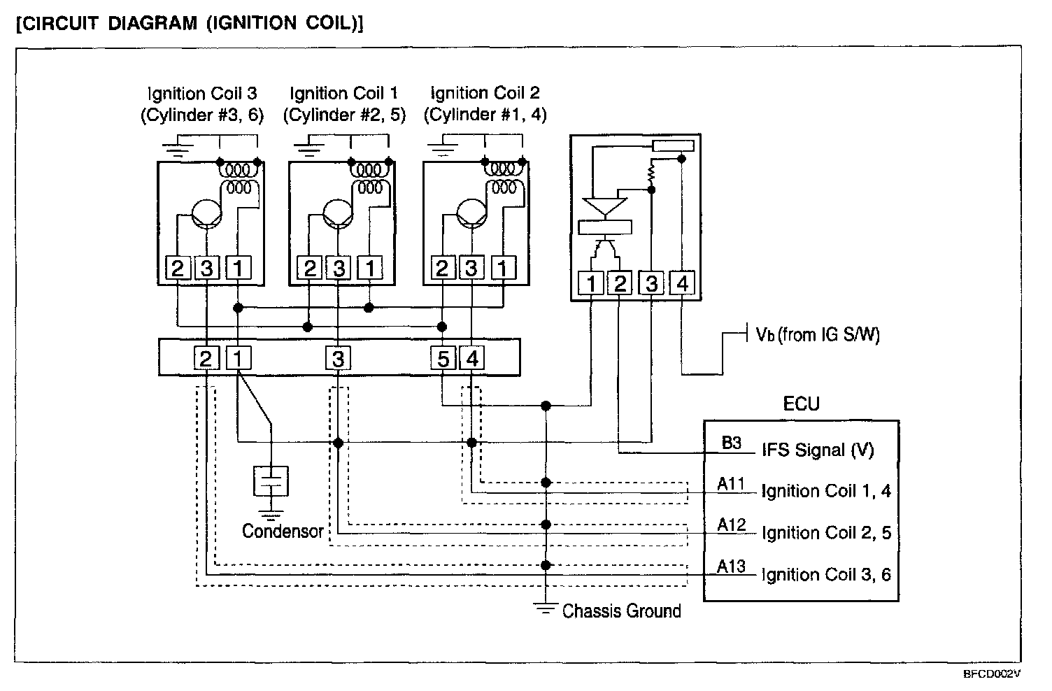 IGNITIONThe ignition power transistor functions to control the ignition timing by controlling the ignition coil primary current through signals from the ECU and the ignition coil is of the type of ignition order of (#1/#4), (#2/#5), (#3/#6) and is controlled by the power TR built in the ECU.