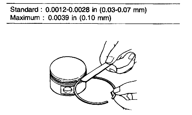 1. Insert a new piston ring into a piston ring groove and check clearance between piston ring and ring end. Clearance between ring and ring end