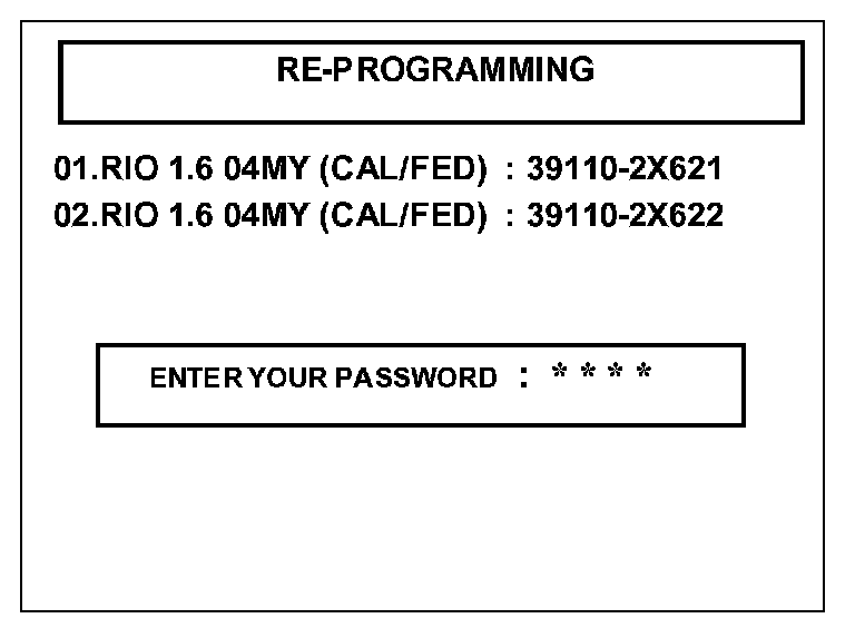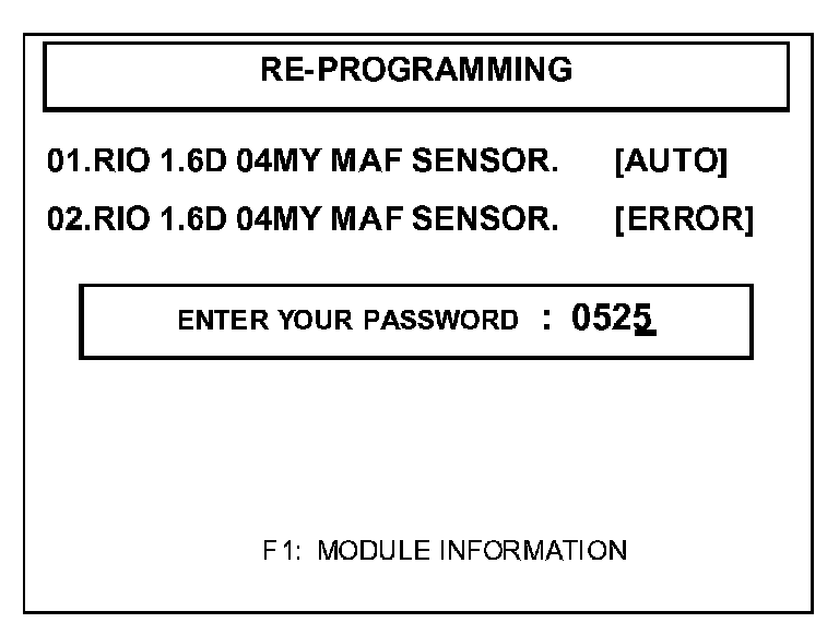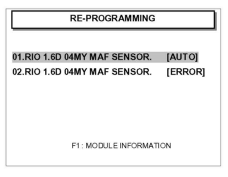 ^ "REPROGRAMMING ERROR PLEASE CHECK SYSTEM" - In this case, you must reprogram manually by selecting menu option "02. RIO 1.6D 04MY MAF SENSOR. [ERROR]".