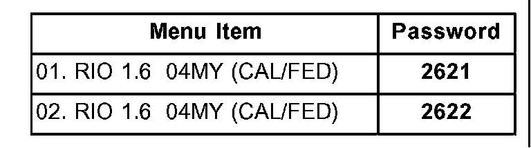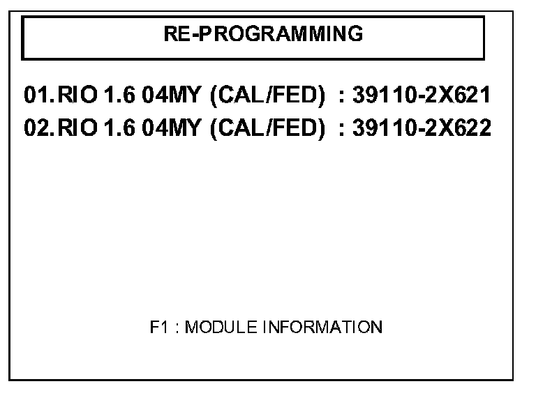 If the REPROGRAMMING Selection menu item "01 - RIO 1.6D 04MY MAF SENSOR. [AUTO]" fails to download properly, then option "02. RIO 1.6D 04MY MAF SENSOR. [ERROR]" must be used. Confirm all connections are established as shown in the "AUTOMATIC REPROGRAMMING PROCEDURE" before continuing.