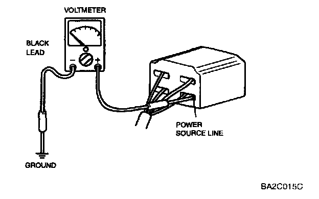 The DC voltmeter measures circuit voltage. A voltmeter with a range of 15 V or more is used by connecting the positive (+) probe (red lead wire) to the point where voltage is to be measured, and the negative (-) probe (black lead wire) to a body ground.