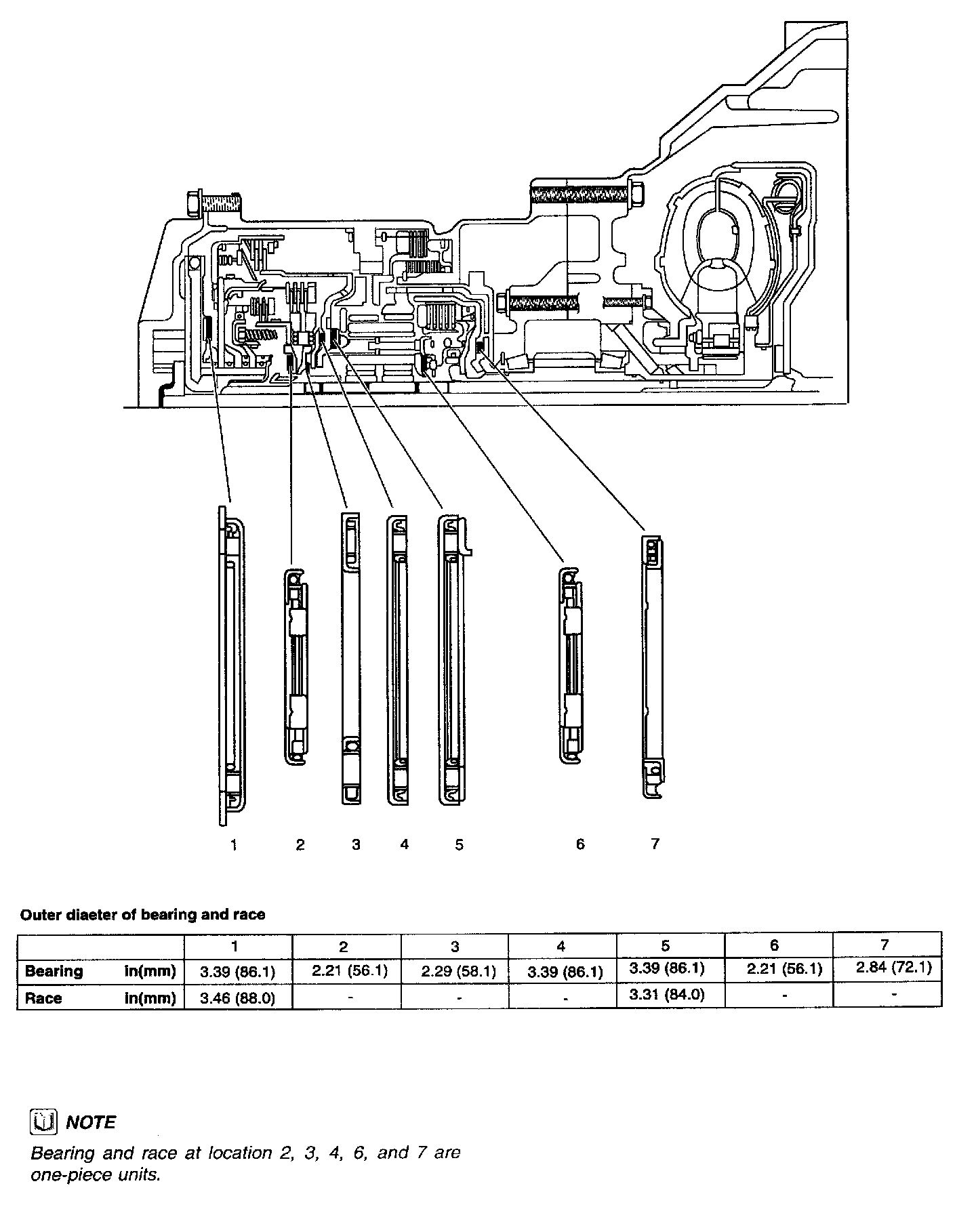 Bearing and race at location 2, 3, 4, 6, and 7 are one-piece units.