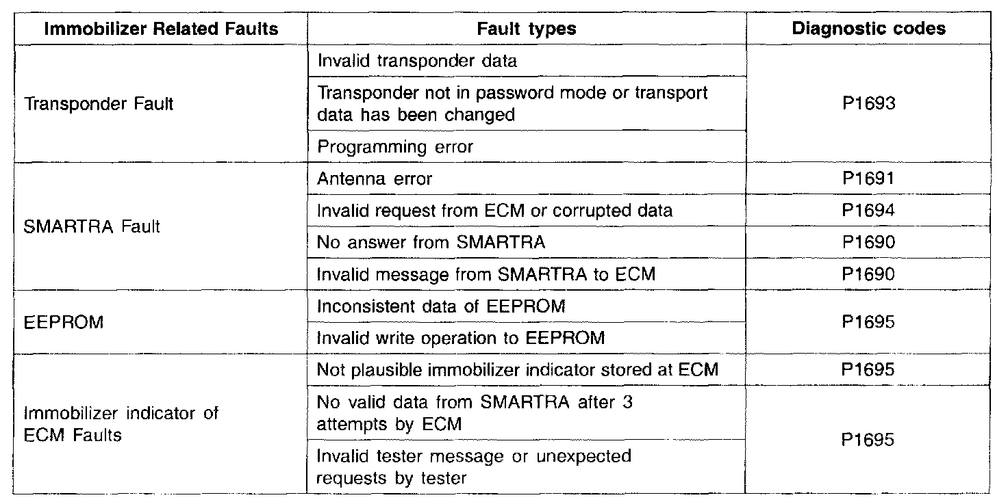 There are four different faults that are assigned to the immobilizer system. Every fault is broken down into four different types (circuit malfunction, circuit range / performance problem, low input, high input) The following table shows the assignment of immobilizer related faults to each type.