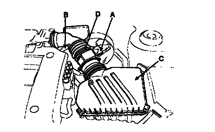 2) Disconnect the breather hose (B) from intake air hose (D).