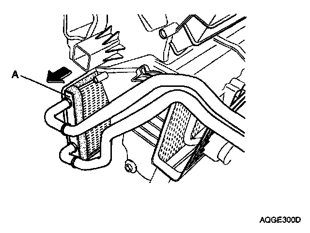 10. Be careful not to bend the inlet and outlet pipes during heater core(A) removal, and pull out the heater core.