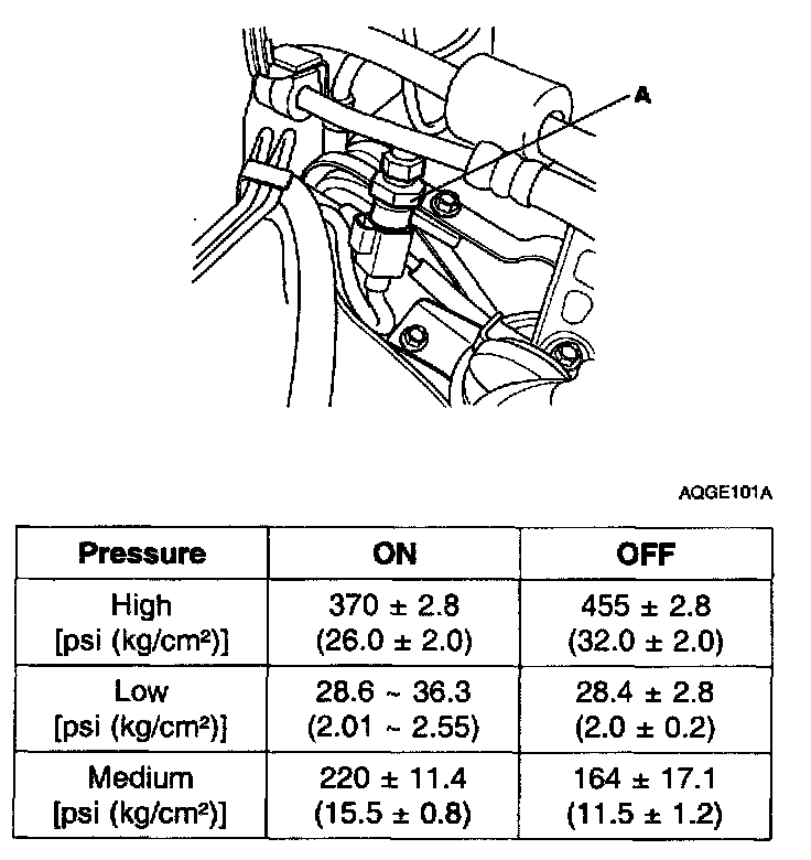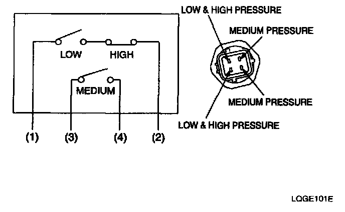 DESCRIPTIONThe triple switch is a combination of a medium switch as well as conventional low pressure and high pressure switches. The low pressure switch will be turned off to stop compressor operation if refrigerant pressure is low. The high pressure switch will be turned off to stop compressor operation if refrigerant pressure is too high. The medium switch will be turned on at medium level pressure to cool the A/C system operating radiator fan and condenser fan at high speed.