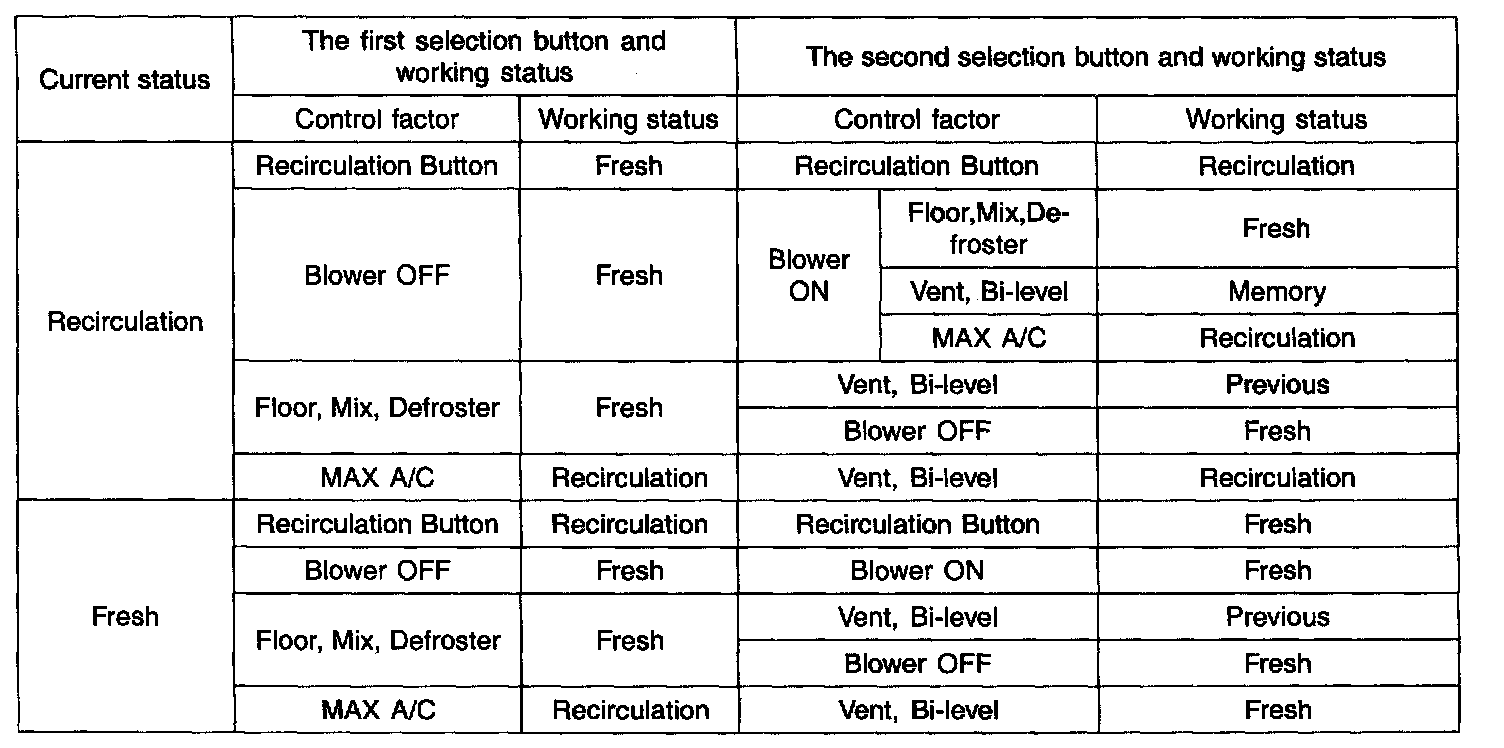 1. With IG OFF -->ON or blower OFF = > ON in the Vent/Bi-level mode, fresh/recirculation maintain the memory status.