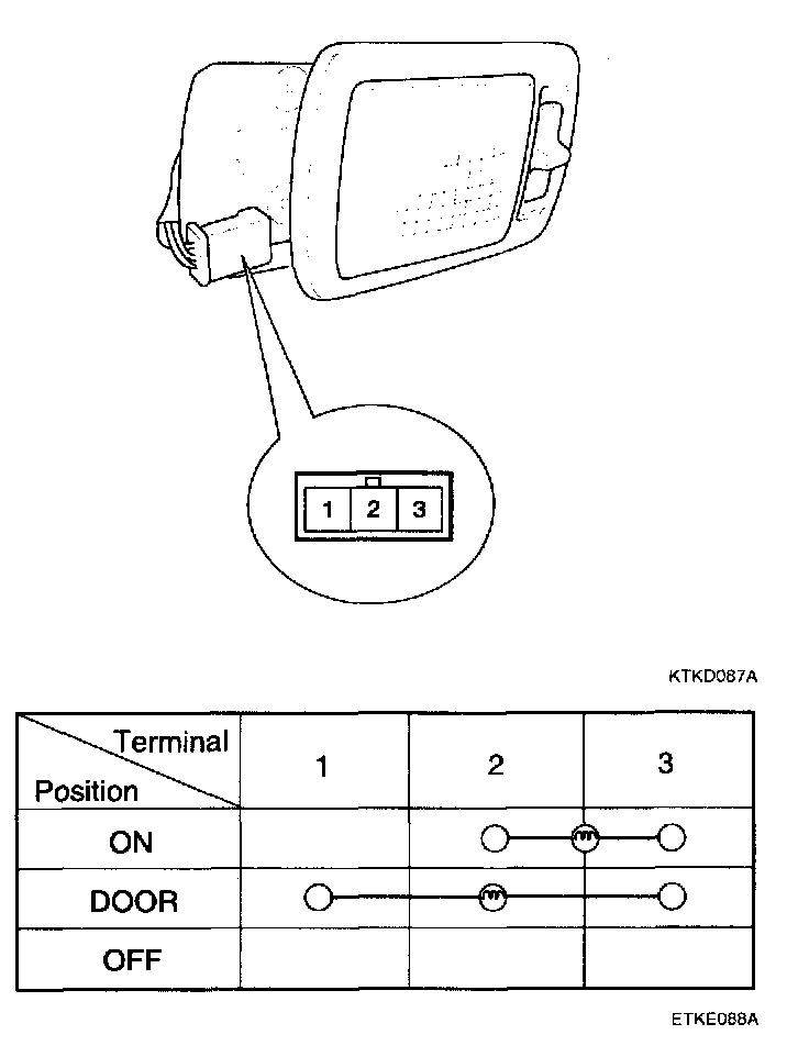 Remove the room lamp assembly then check for continuity between terminals