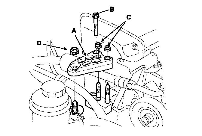 2) Remove the bolt (B), nuts (C,D) and engine mounting support bracket (A).