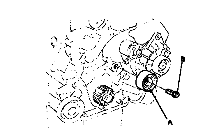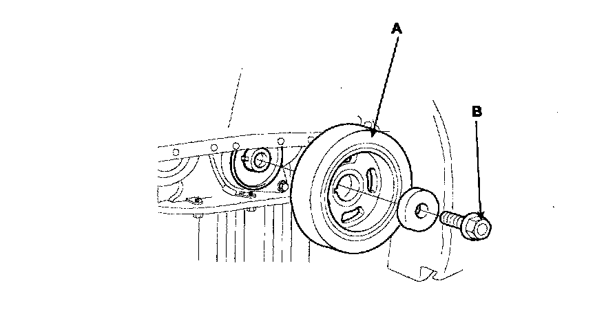 12. Install the flange and crankshaft pulley(A), and then tighten crankshaft pulley bolt(B). Make sure that the crankshaft sprocket pin fits into the small hole in the pulley.
