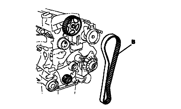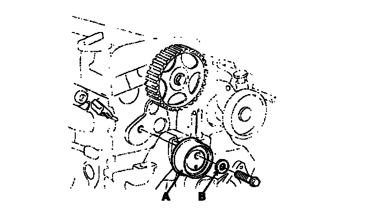 15. Remove the timing belt tensioner(A) and timing belt(B).
