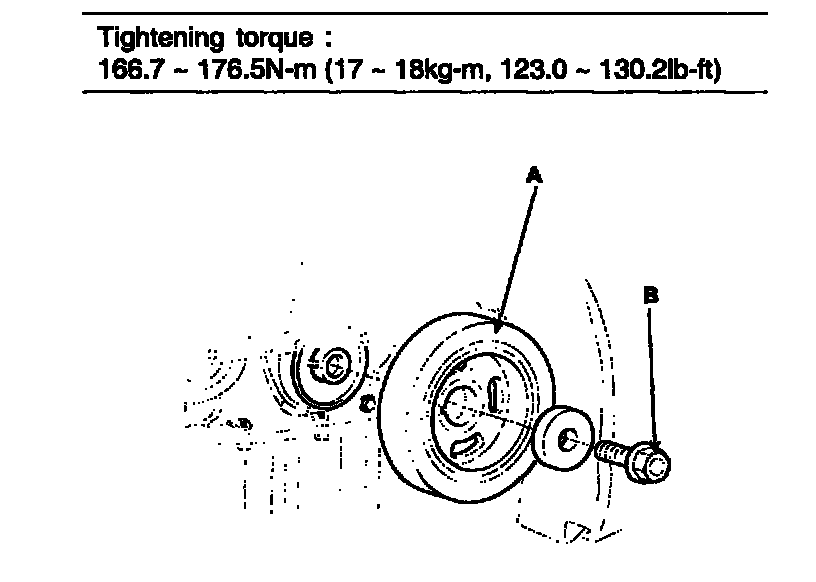 12. Remove the crankshaft pulley bolt(B) and crankshaft pulley(A).
