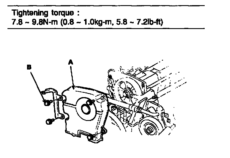 11. Install the timing belt lower cover(A) with 5bolts(B).