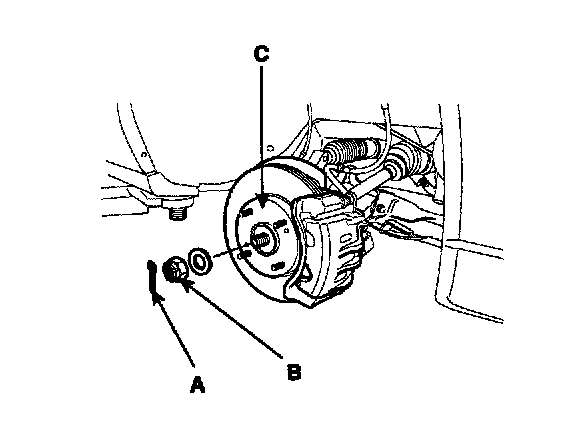 2. While applying the brakes, remove the split pin(A), then remove the locknut(B) and washer from the front hub(C).
