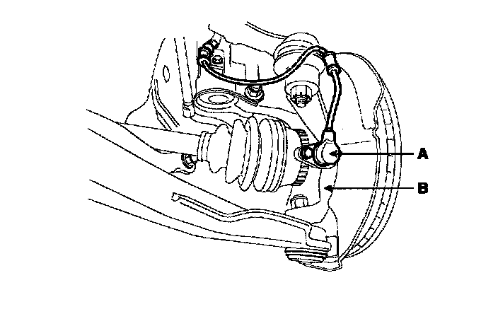 4. Remove the wheel speed sensor(A) from the knuckle(B).
