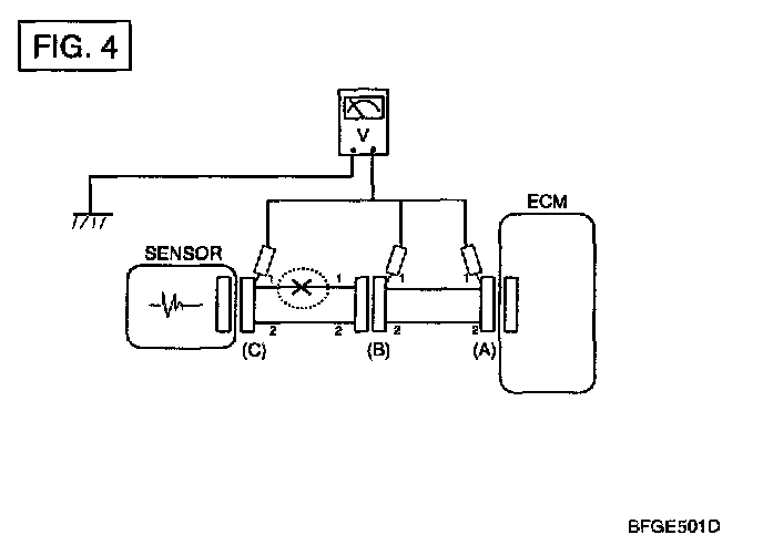 a. With each connector still connected, measure the voltage between the chassis ground and terminal 1 of each connectors (A), (B) and (C) as shown in [FIG.4].