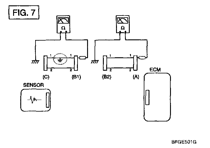 b. Disconnect connector (B), and measure the resistance between connector (A) and chassis ground, and between (B1) and chassis ground as shown in [FIG.7].