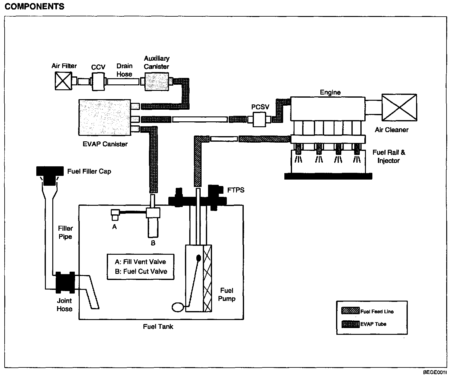 When the fuel evaporates in the fuel tank, the vapor passes through vent hoses or tubes to EVAP. canister filled with charcoal and the EVAP. canister temporarily holds it with charcoal. If ECM wants to draw the gathered vapor into the combustion chambers during certain operating conditions, it will make vacuum in intake manifold to move it.