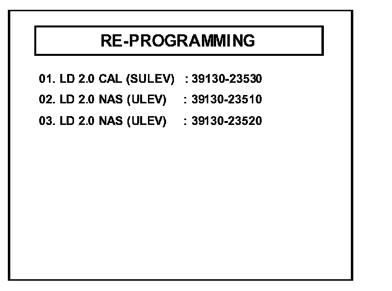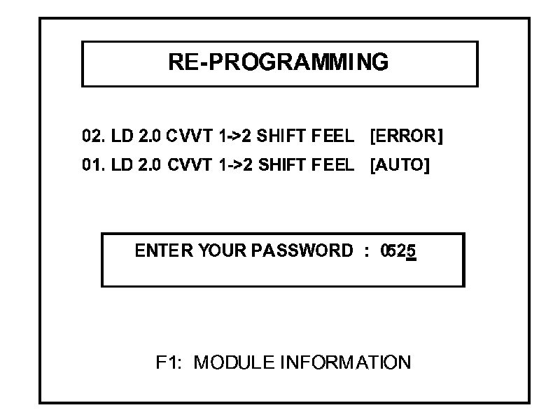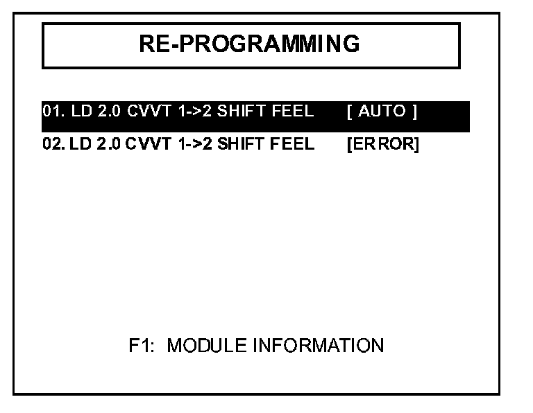 ^ "REPROGRAMMING ERROR PLEASE CHECK SYSTEM" - In this case, you must reprogram manually by selecting menu option "02. LD 2.0 CVVT 1->2 SHIFT FEEL [ERROR]".