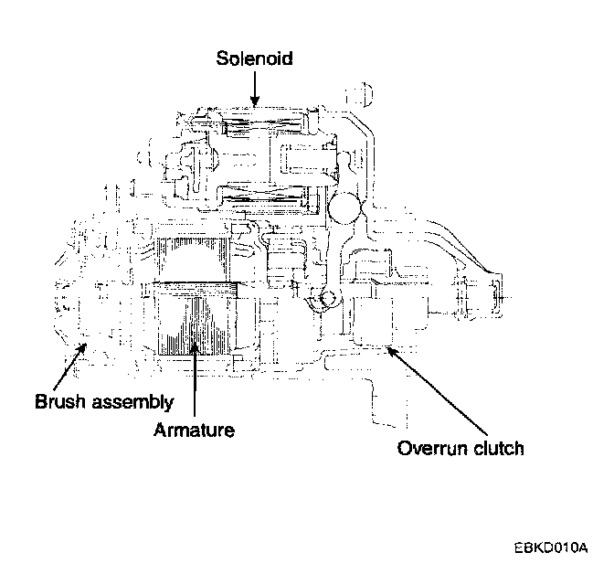 The contacts close and the starter motor cranks. In order to prevent damage caused by excessive rotation of the starter armature when the engine starts, the clutch pinion gear overruns.