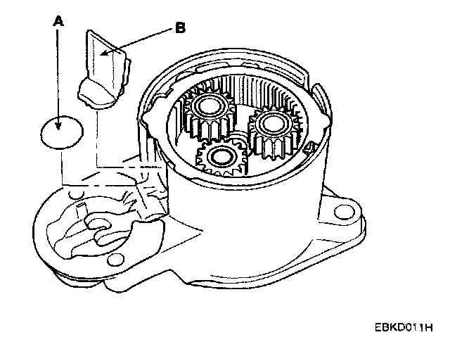 11. Disconnect the stop ring (A), overrunning clutch (B), internal gear (C) and planet shaft (D).