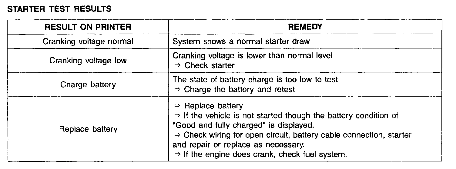 Take a relevant action according to the test results by referring to the starter test results as given below.