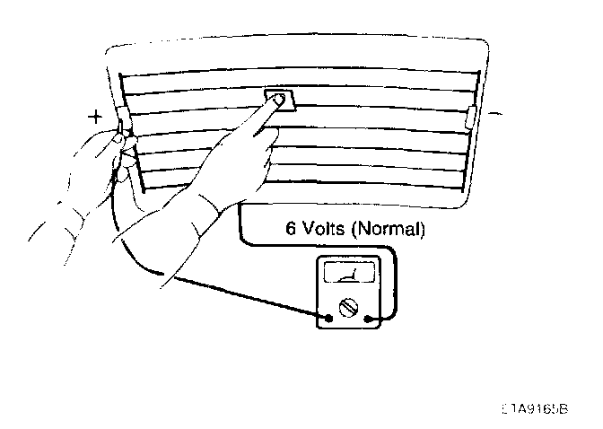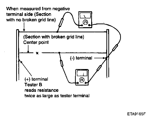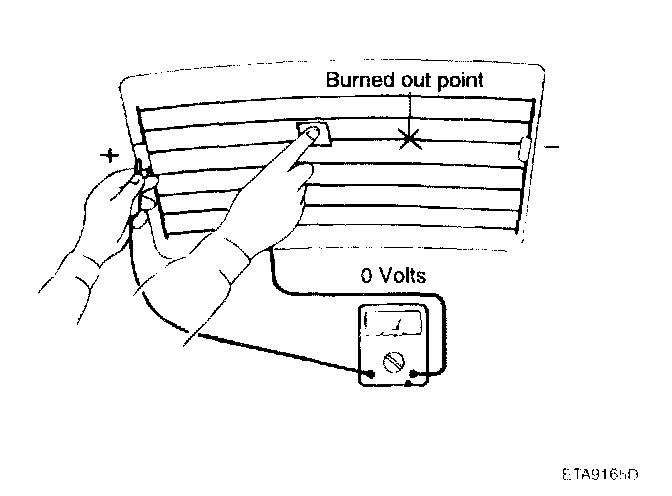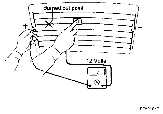 5. Use an ohmmeter to measure the resistance of each heater line between a terminal and the center of a grid line, and between the same terminal and the center of one adjacent heater line. The section with a broken heater line will have a resistance twice as that in other sections. In the affected section, move the test lead to a position where the resistance sharply changes.