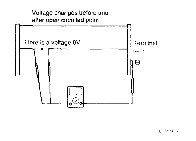 4. To check for open circuits, slowly move the test lead in the direction that the open circuit seems to exist. Try to find a point where a voltage is generated or changes to 0V. The point where the voltage has changed is the open-circuit point.