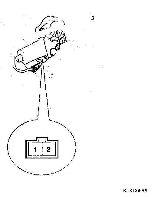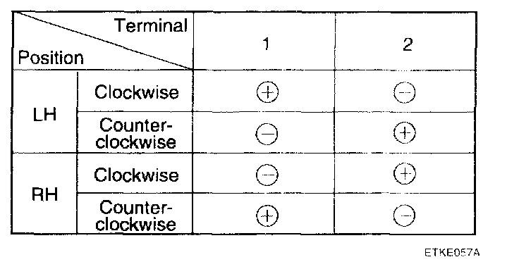 3. Connect the motor terminals directly to battery voltage (12V) and check that the motor operates smoothly. Next, reverse the polarity and check that the motor operates smoothly in the reverse direction. If the operation is abnormal, replace the motor.