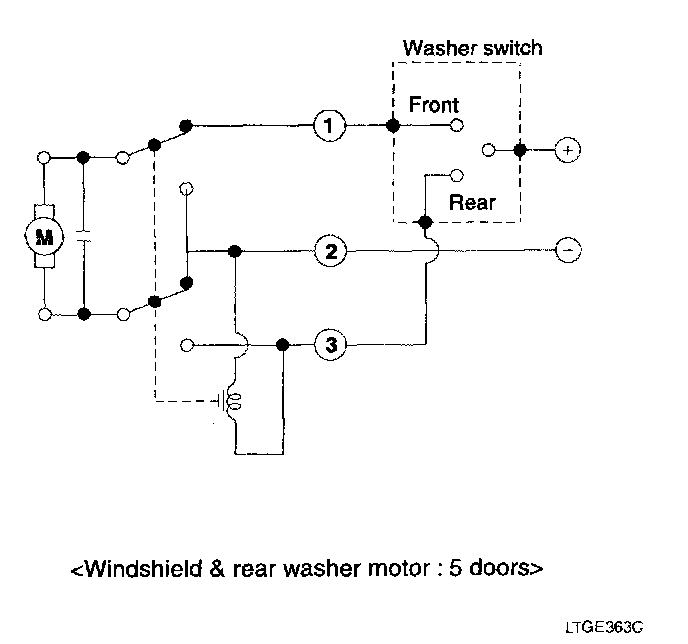 2. Connect positive (+) and negative (-) battery cables to terminals 1 and 2 respectively to see that the washer motor runs and water sprays from the front nozzles.