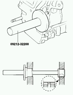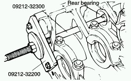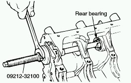 3. Using a special tool, remove teh left counter balance shaft rear bearing from cylinder block. At this time, install special tool on the front surface of cylinder block to hold the bearing puller.