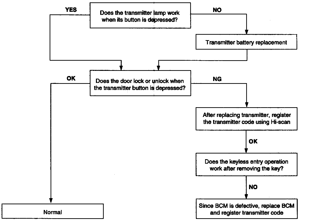 7. Central door lock function works, but keyless entry system does not work.