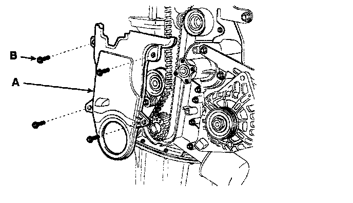 13. Remove the 4 bolts (B) and timing belt lower cover (A).