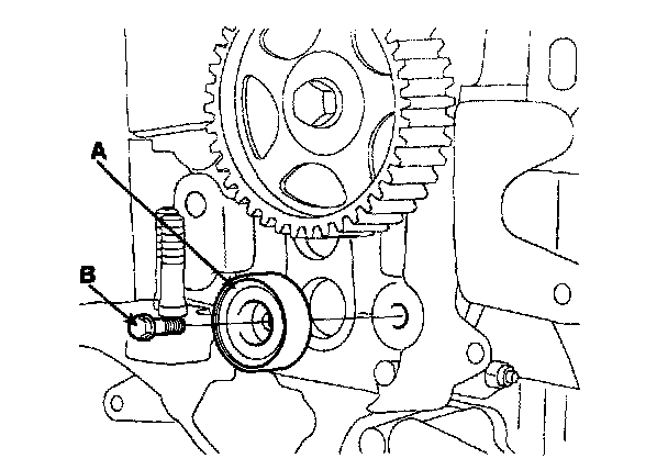 15. Remove the bolt (B) and the timing belt idler (A).