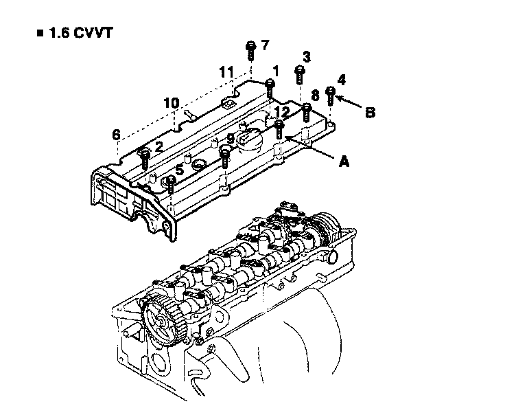 1) Install the cylinder head cover (A) and bolts (B).