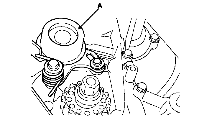 6. Temporarily install the timing belt tensioner (A).