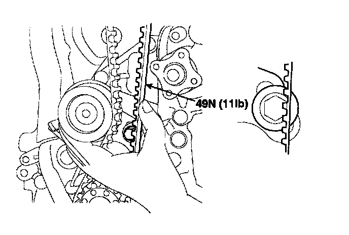 Verify that when the tensioner and the tension side of the timing belt are pushed in horizontally with a moderate force [approximately 49 N (11 lbs.)], the timing belt cog end is approximately 1/2 of the tensioner mounting bolt head radius (across flats) away from the bolt head center.