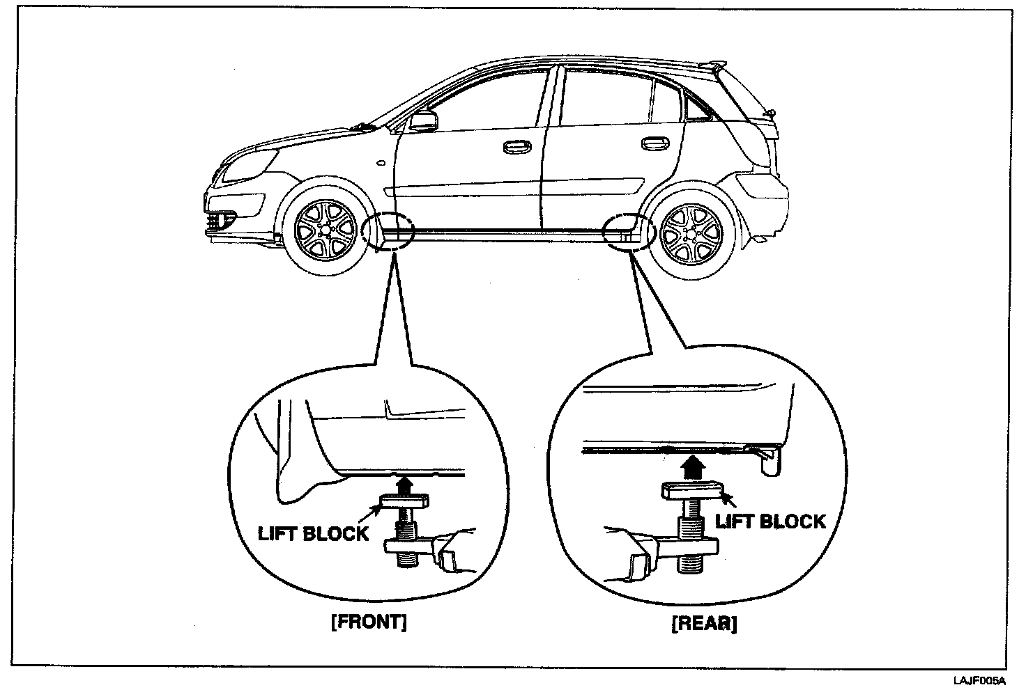 LIFT AND SUPPORT POINTSWARNING: When heavy rear components such as suspension, fuel tank, spare tire, tailgate and trunk lid are to be removed, place additional weight in the luggage area before hoisting. When substantial weight from the rear of the vehicles the center of gravity may change and cam cause the vehicle to tip forward on the hoist.