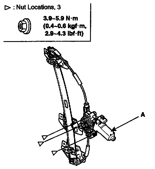 3. After loosening the power window motor mounting nuts, remove the power window motor (A).