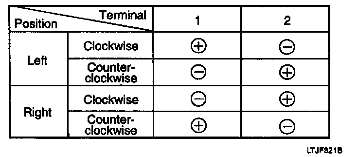 3. Connect the motor terminals directly to battery voltage (12 V) and check that the motor operates smoothly. Next, reverse the polarity and check that the motor operates smoothly in the reverse direction. If the operation is abnormal, replace the motor.