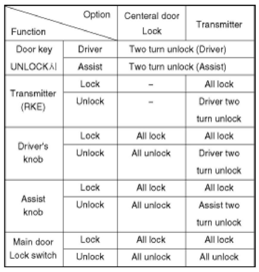 1. When unlocking the driver door using the driver door key or RKE, only the driver door is unlocked.