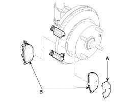2. Check the foreign material at the pad shim (A) and the back of the pads (B).