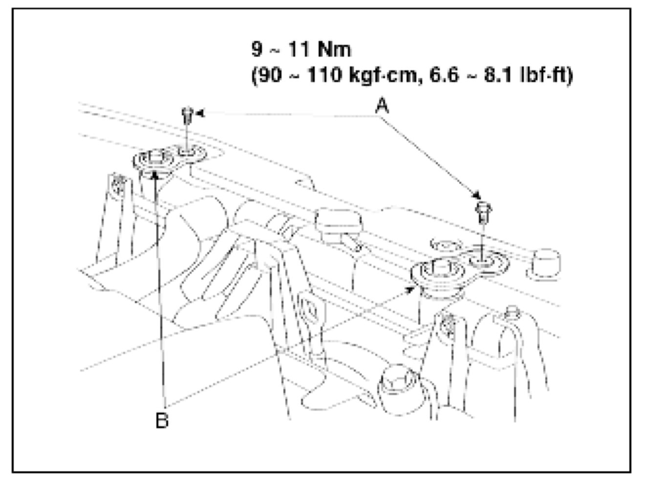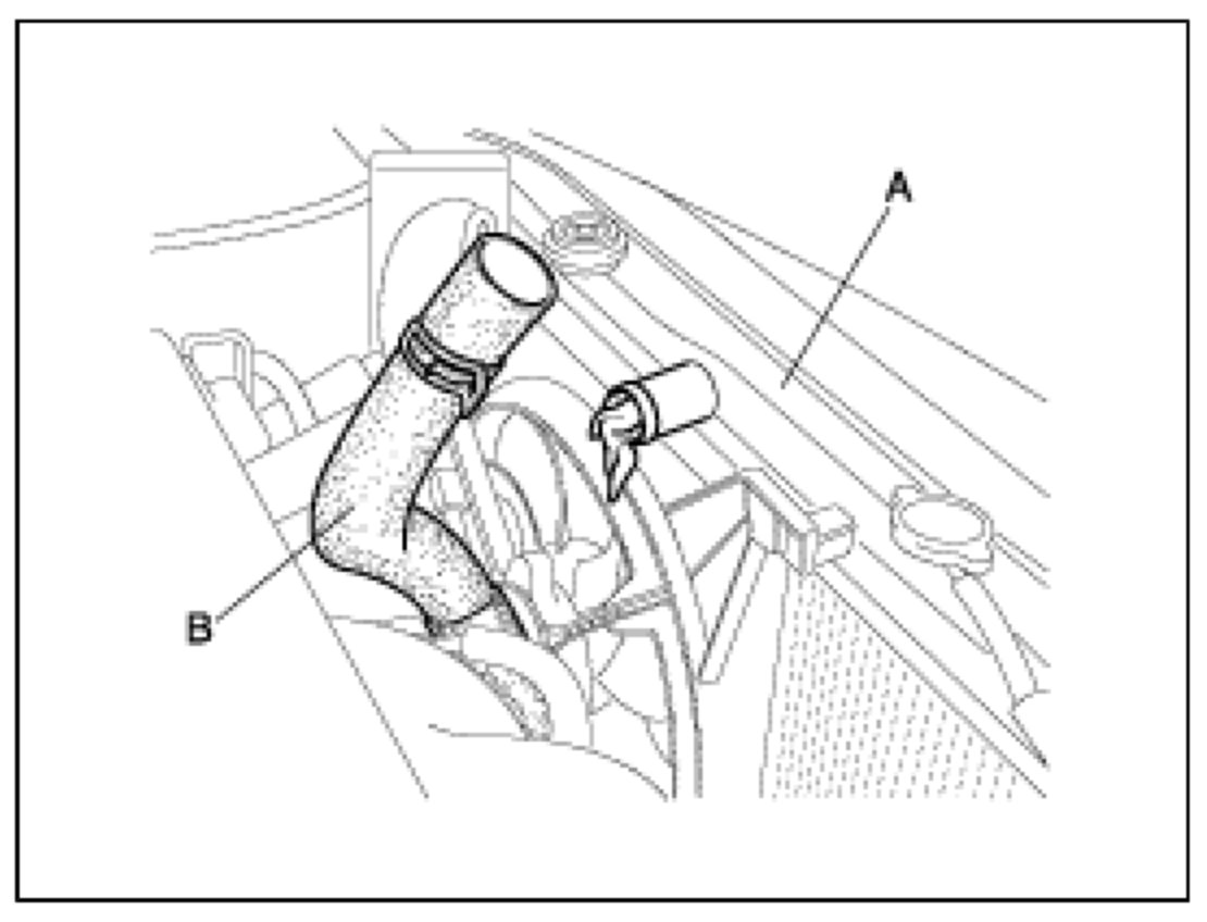 7. Remove the bolts (A), then remove the upper mount brackets (B) from the radiator.
