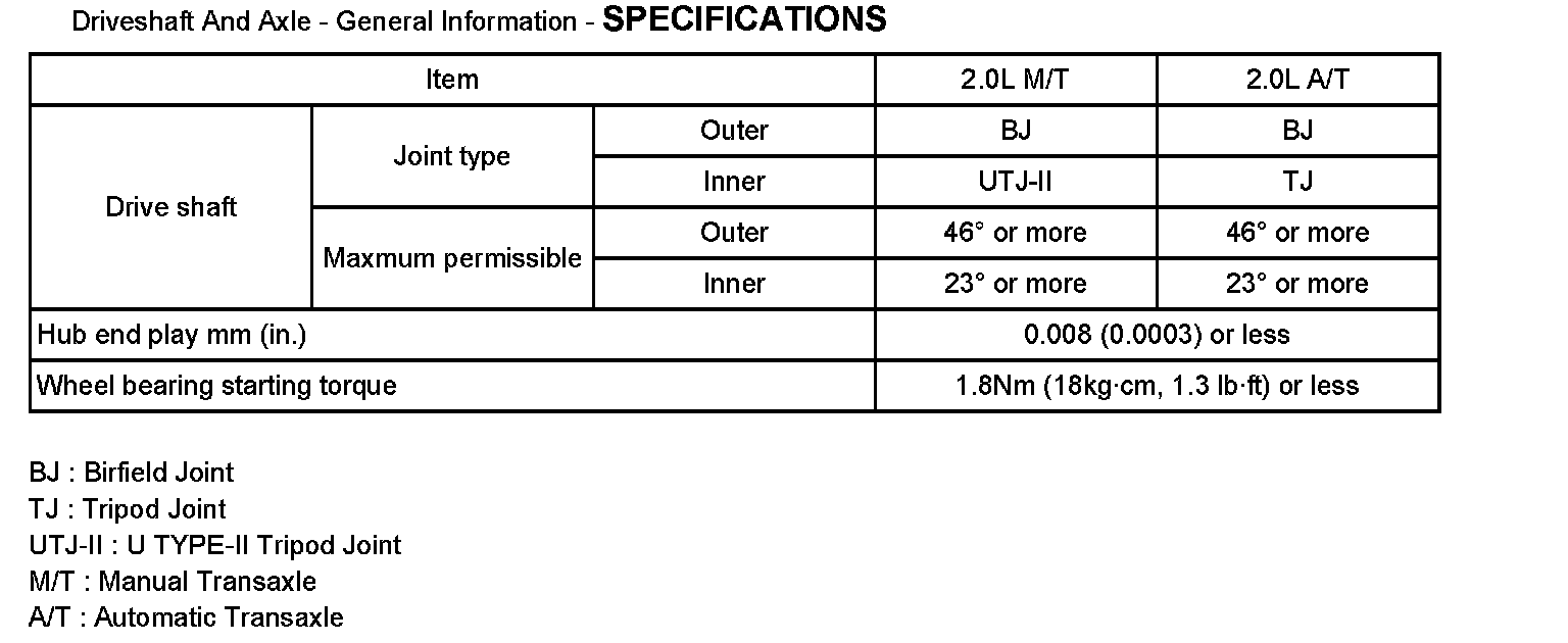 Drive Axles, Bearings and Joints: Specifications