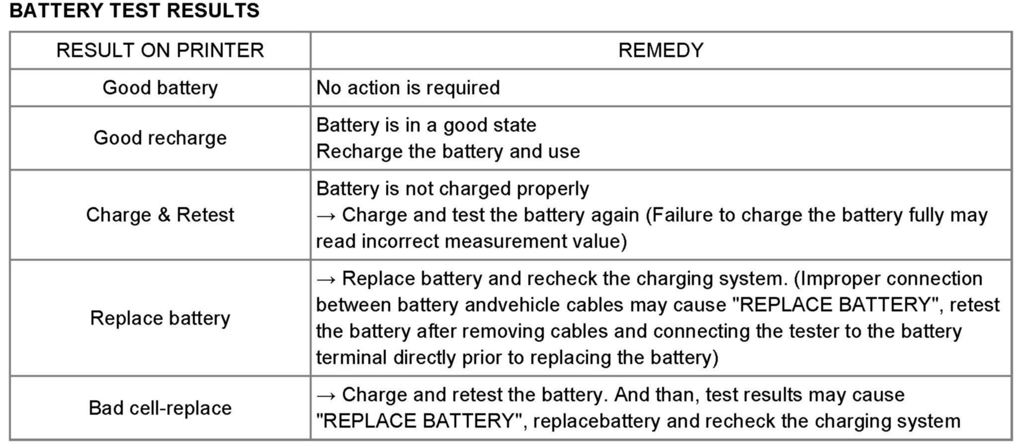 A relevant action must be given according to the test results by referring to the battery test results as shown in the table.