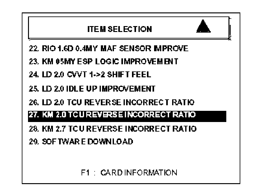 3. For SPECTRA (LD) TCM reprogramming, select option "26. LD 2.0 TCU REVERSE INCORRECT RATIO" and press ENTER. For SPORTAGE (KM) TCM reprogramming, select option "27. KM 2.0 TCU REVERSE INCORRECT RATIO" and press ENTER.