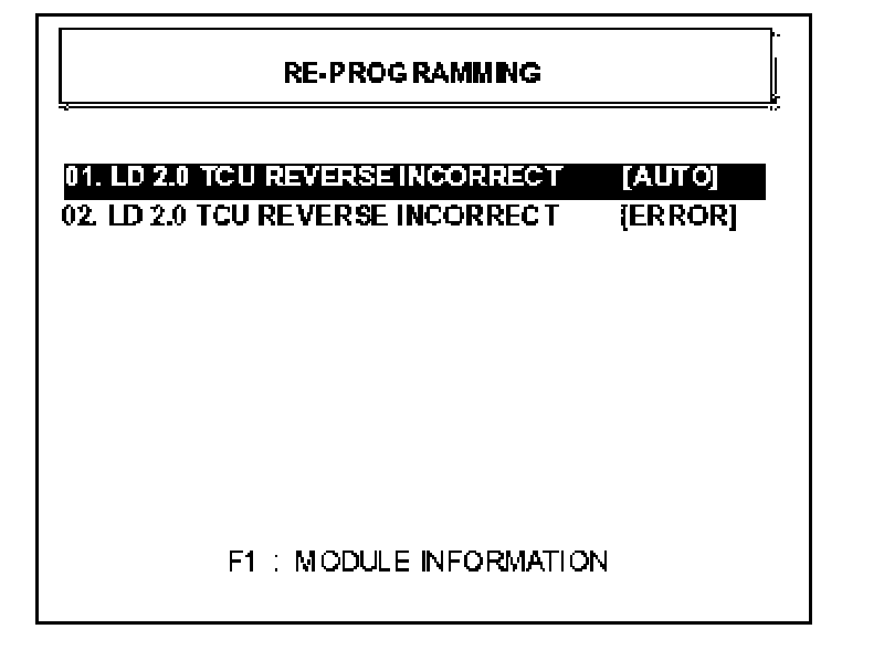 4. For SPECTRA (LD) TCM reprogramming, select option "01. LD 2.0 TCU REVERSE INCORRECT [AUTO]" and press ENTER.