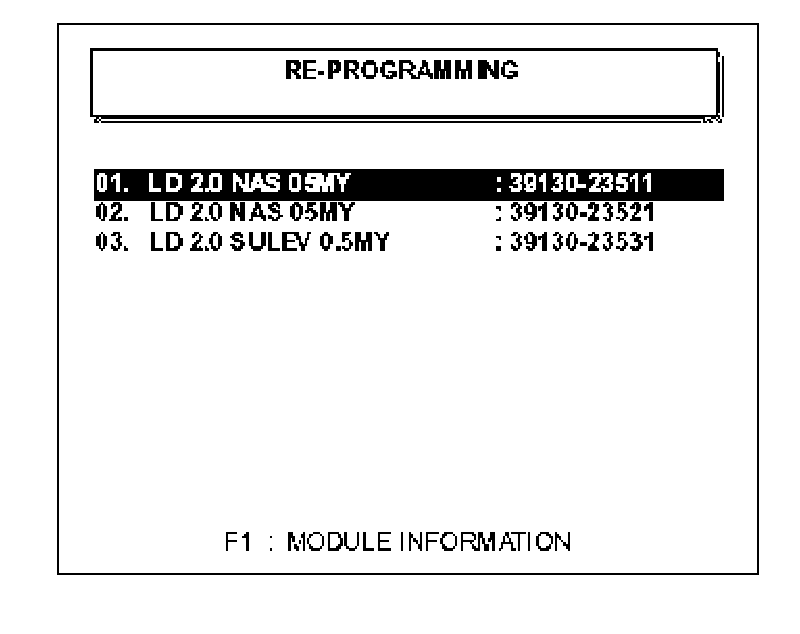 4. For SPECTRA (LD) TCM reprogramming, select option "02. LD 2.0 TCU REVERSE INCORRECT [ERROR]" and press ENTER. For SPORTAGE (KM) TCM reprogramming, select option "02. KM 2.0 TCU REVERSE INCORRECT [ERROR]" and press ENTER.