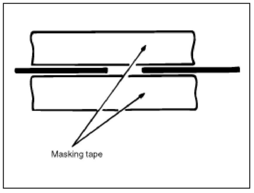Wipe the glass adjacent to the broken heater line, clean with silicone remover and attach the masking tape as shown. Shake the conductive paint container well, and apply three coats with a brush at intervals of about 15 minutes apart. Remove the tape and allow sufficient time for drying before applying power. For a better finish, scrape away excess deposits with a knife after the paint has completely dried. (Allow 24 hours).